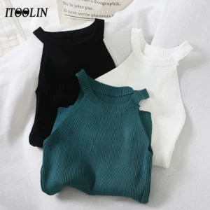 ITOOLIN New Women Tank Top Knit Off Shoulder Sexy Round Neck T-Shirt Women’s Solid Color Halter Camisole 2024 Summer