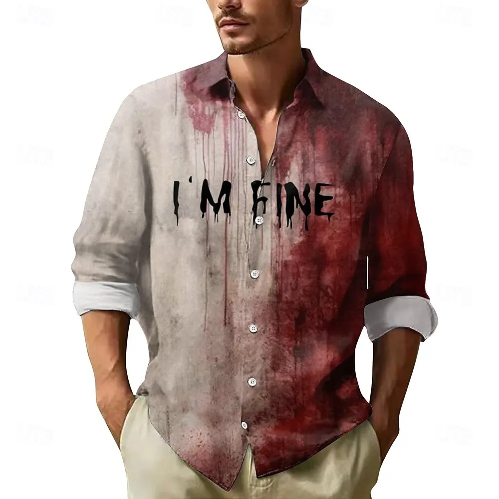 2025 Halloween Men’s Letter Printed Blood Stains Shirt Button Up Shirt Long Sleeve Dark Punk Gothic Style Streetwear Men’s Tops