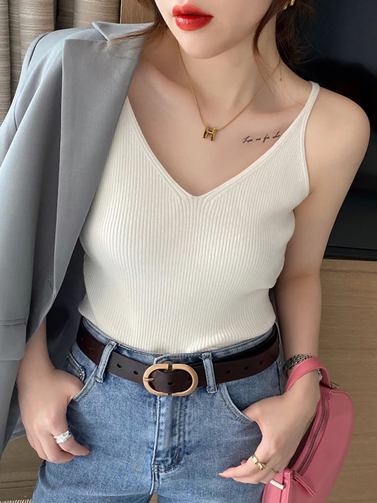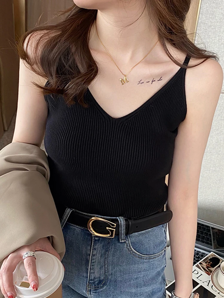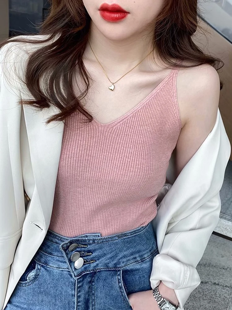 Korea Summer Tops New Solid V-Neck Elastic Knitted Suspender Camis Women’s Tanks Clothing Basics Shirt