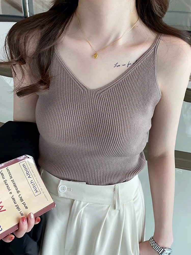 Home woman top Korea Summer Tops New Solid V-Neck Elastic Knitted Suspender Camis Women’s Tanks Clothing Basics Shirt