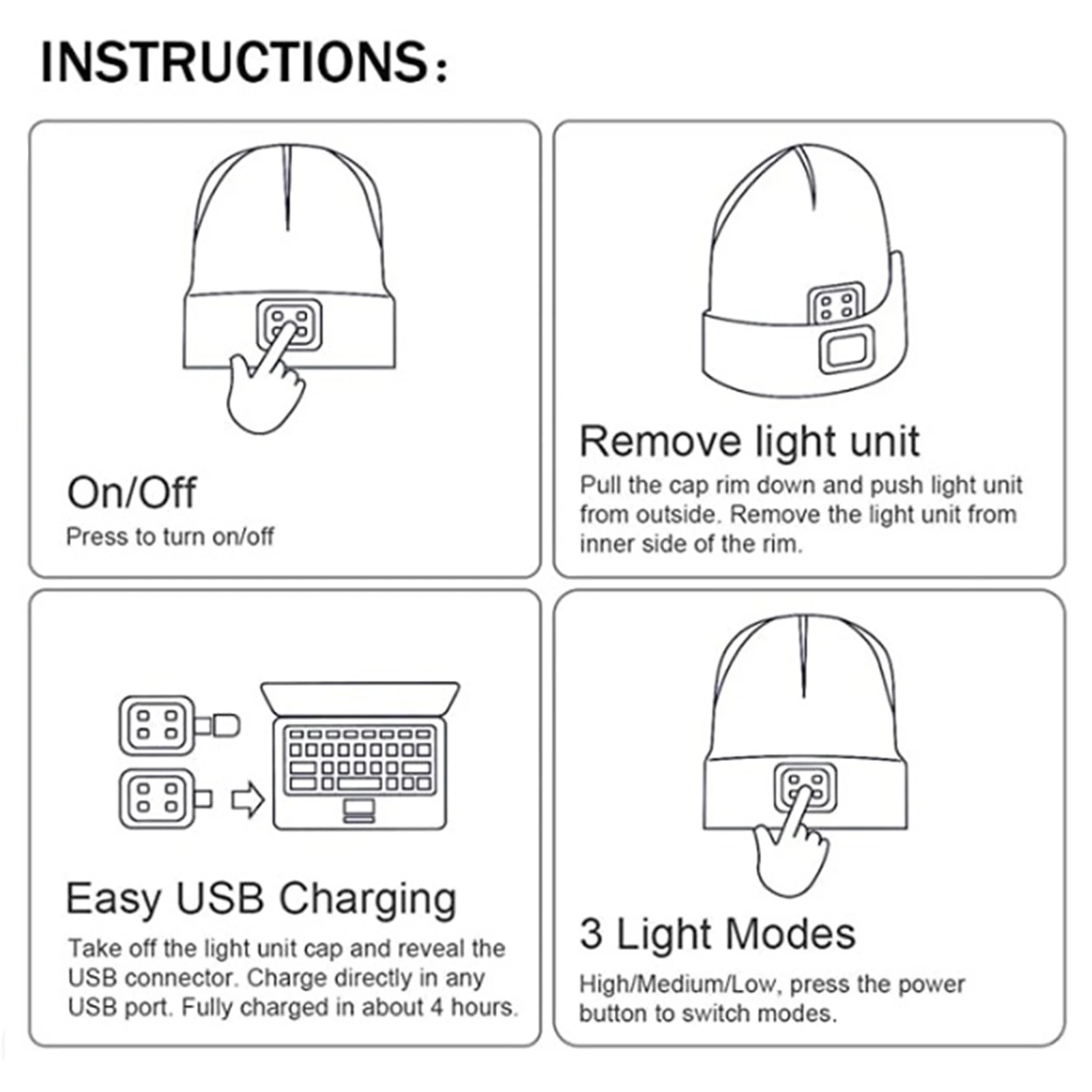 Feature: 1. Soft and stretchable material can keep the body healthy and comfortable to the maximum extent. 2. The LED lamp on the hat can provide great convenience in dark environment. 3. Built in lithium-ion rechargeable battery, long standby time. 4. Knitted solid color and print design, simple and fashionable. 5. Suitable for winter use and night travel.Specification: Material: Acrylic Light source: 4 LED Power supply mode: Lithium ion battery Usage time: White light with three different brightness Use the brightest gear for about 2 hours The middle gear is used for about 4 hours use the low brightness gear for about 6-8 hours. Weight: about 105g Size: One size Applicable crowd: Adult men and women Color: Blue, Coffee, Navy Blue, Pink, Black, White, Red, Orange, Green, Camouflage, Color, Silver, Yellow, Dark Green, Purple Uses: Mountaineering, camping, night fishing, etc.Note: 1. Due to the different monitor and light effect, the actual color of the item might be slightly different from the color showed on the pictures. Thank you! 2. Please allow slightly measuring deviation due to manual measurement. ![]() 1 X Light Cap