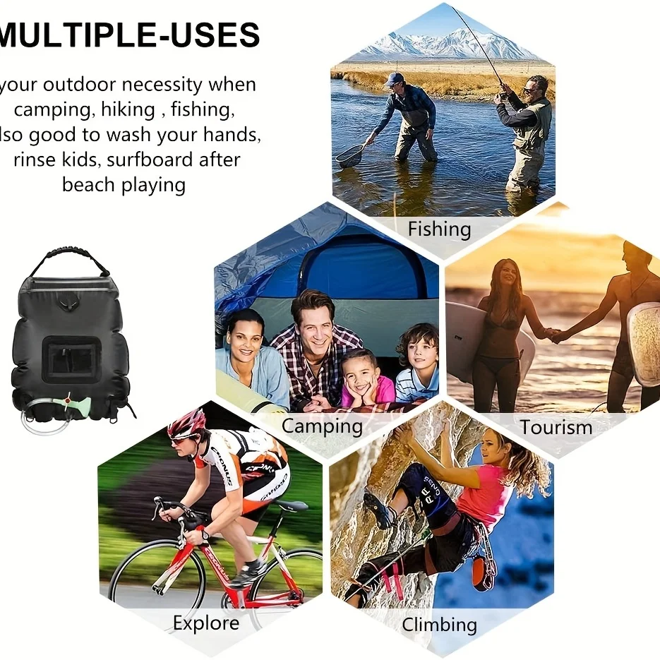 Portable solar shower bag, temperature design: Endothermic design, direct sunlight for 3 hours to heat water to 113°C. Lightweight, foldable design, easy to carry.