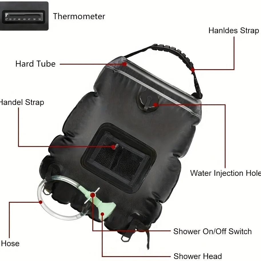 Premium shower head Camping shower bag: Comes with hose, shower head and faucet. Upgraded shower heads offer easy on/off switches for low flow to high flow and easy rotation. Bring you a better shower experience!