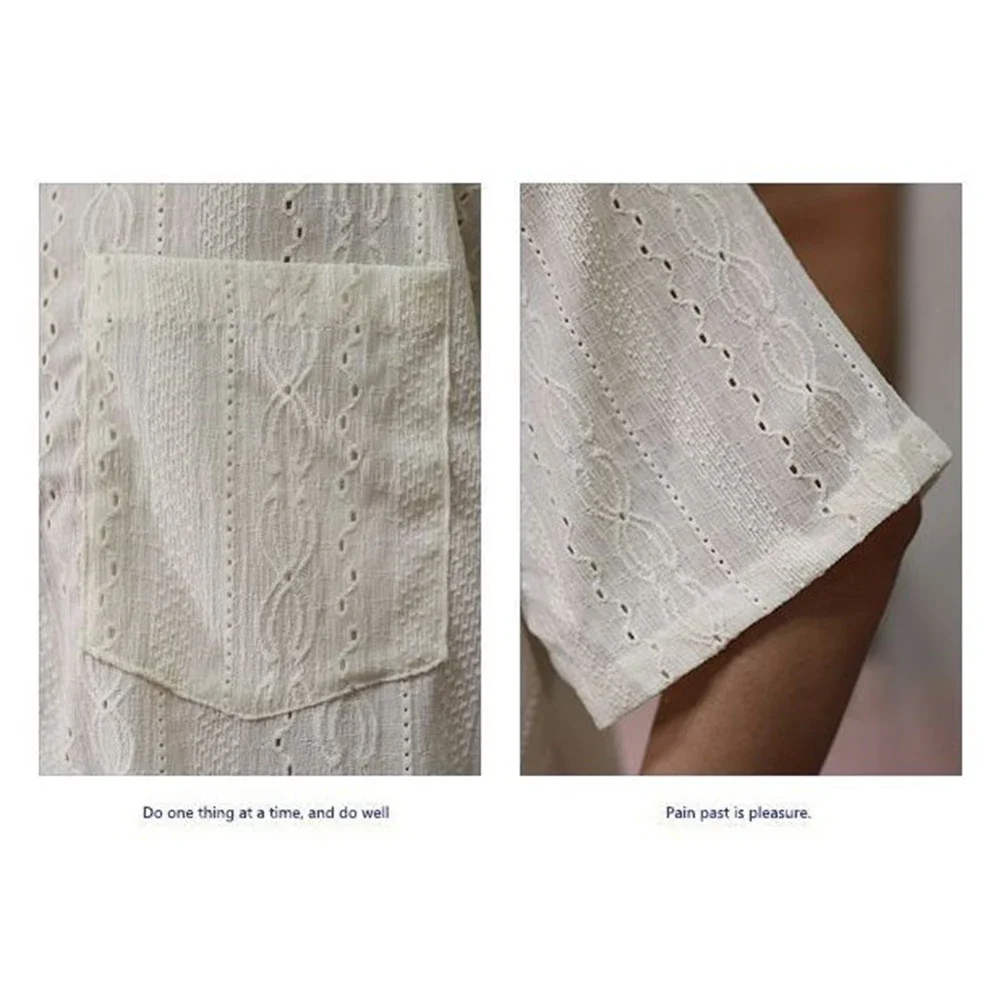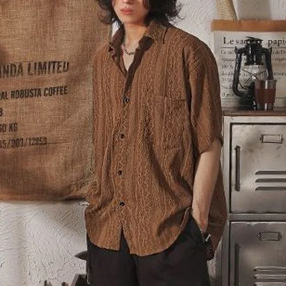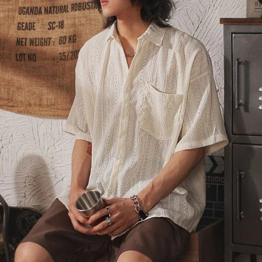 Summer New Men Casual Loose Hollow Out Short Sleeve Shirts Pockets Retro Fashion Vacation Daily All-Match Male Tops